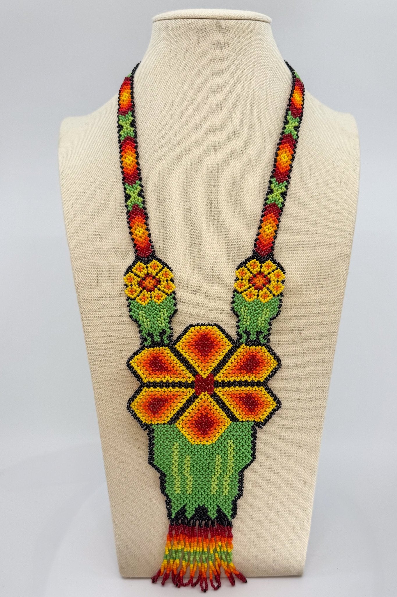 This one-of-a-kind Hicuri (Peyote) beaded necklace is crafted by a Wixárika artistan.